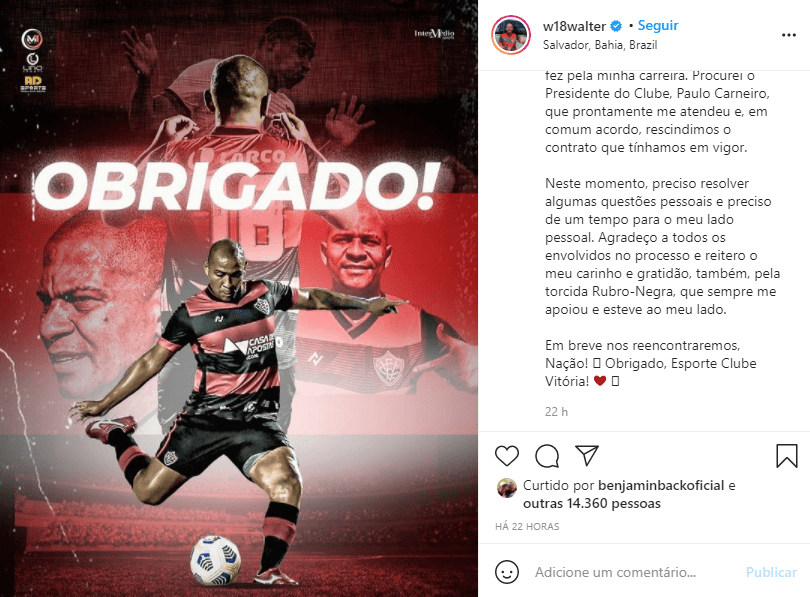 “Gostaria de comunicar a todos o meu desligamento do Esporte Clube Vitória, instituição que eu tenho muita gratidão por tudo que sempre fez pela minha carreira. Procurei o Presidente do Clube, Paulo Carneiro, que prontamente me atendeu e, em comum acordo, rescindimos o contrato que tínhamos em vigor. Neste momento, preciso resolver algumas questões pessoais e preciso de um tempo para o meu lado pessoal. Agradeço a todos os envolvidos no processo e reitero o meu carinho e gratidão, também, pela torcida Rubro-Negra, que sempre me apoiou e esteve ao meu lado”, postou.