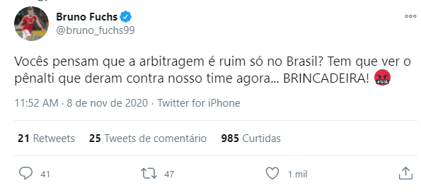 “Vocês pensam que a arbitragem é ruim só no Brasil? Tem que ver o pênalti que deram contra nosso time agora… BRINCADEIRA!”, escreveu Bruno.