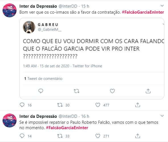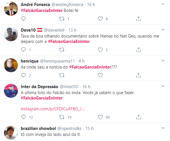Viralizou nas redes sociais a campanha #FalcaoGarciaEnInter, em referência ao centroavante colombiano em negócio com o Internacional. Houve grande repercussão, tanto que a mídia da Colômbia abordou a “notícia”.