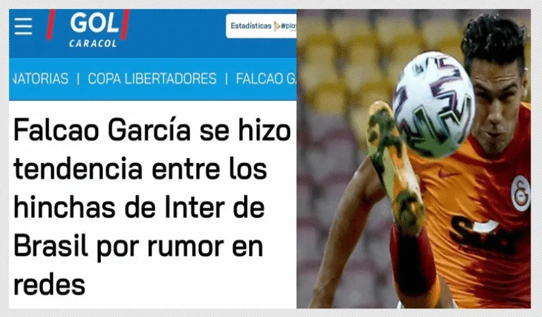 “Enquanto Falcao García está na Turquia trabalhando com Galatasaray e esperando o nascimento de seu quarto filho; do Brasil espalhou-se nas redes sociais um boato sobre uma possível contratação pelo Internacional de Porto Alegre”, diz um trecho da matéria do site gol.caracoltv.com, antes do complemento: