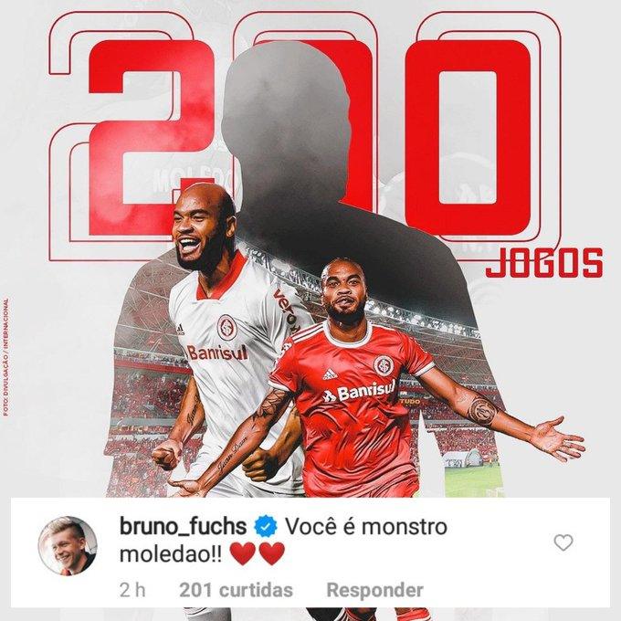 O zagueiro do Internacional, Rodrigo Moledo, postou nas redes sociais após a vitória sobre o Goiás, que alcançou a marca de 200 jogos com a camisa colorada. Entre diversas interações, uma em especial: Bruno Fuchs.
